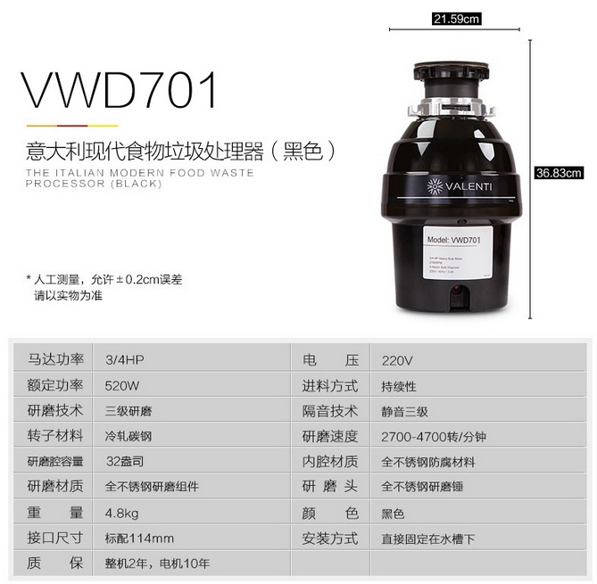 意大利VALENTI 家用廚房食物垃圾處理器處理機(jī)粉碎機(jī)重載型VWD701